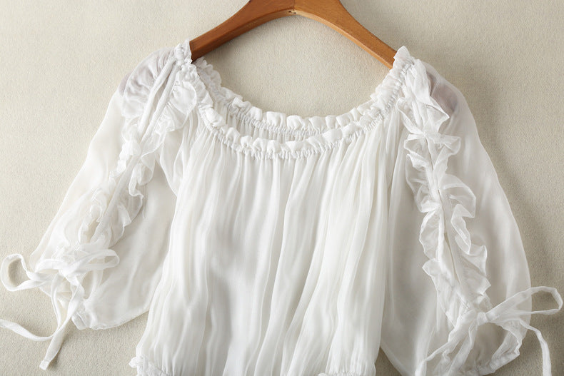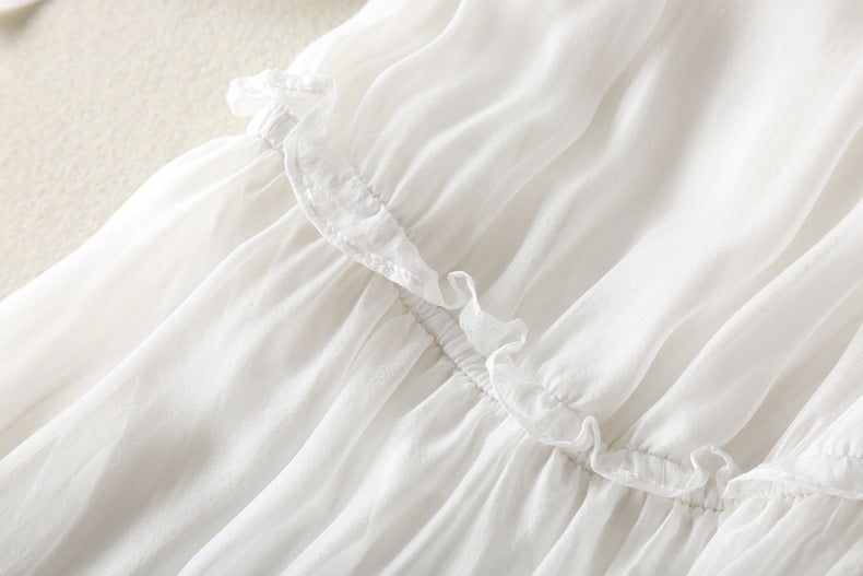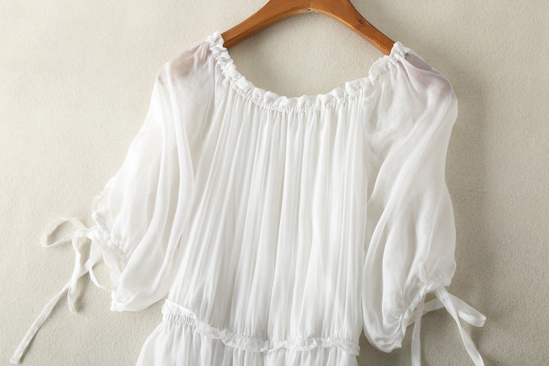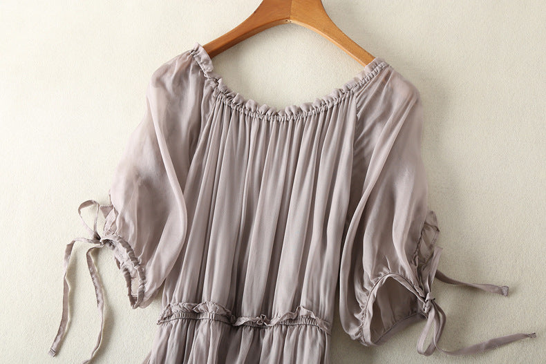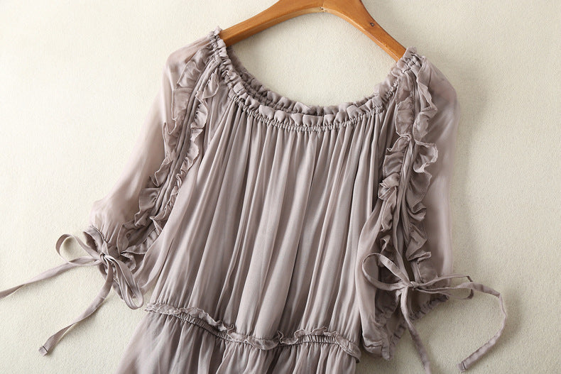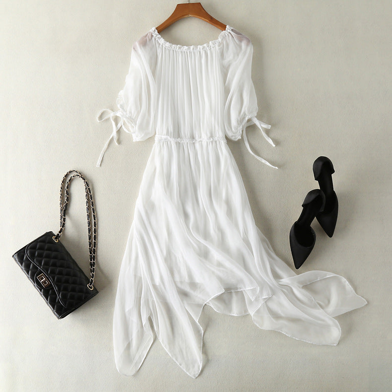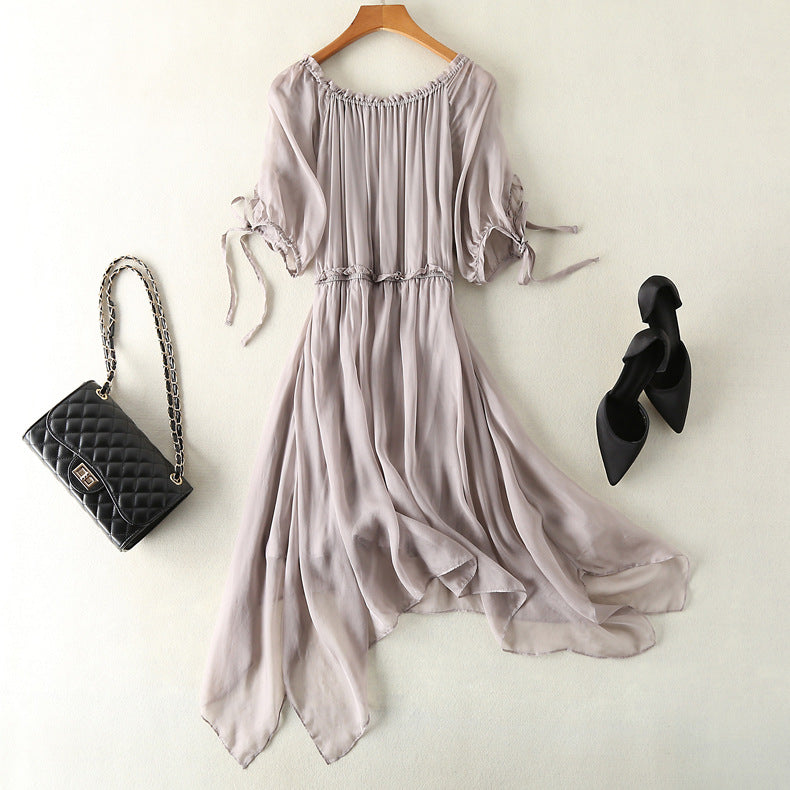 Designed with a mid-waist cut, this dress flatters the figure and adds a hint of sophistication to your look. The main fabric, sourced from the finest silk-producing regions, boasts a smooth and lustrous texture that drapes beautifully. The artistic irregularity in the hemline adds a playful and trendy touch, making this dress a statement piece for any occasion.